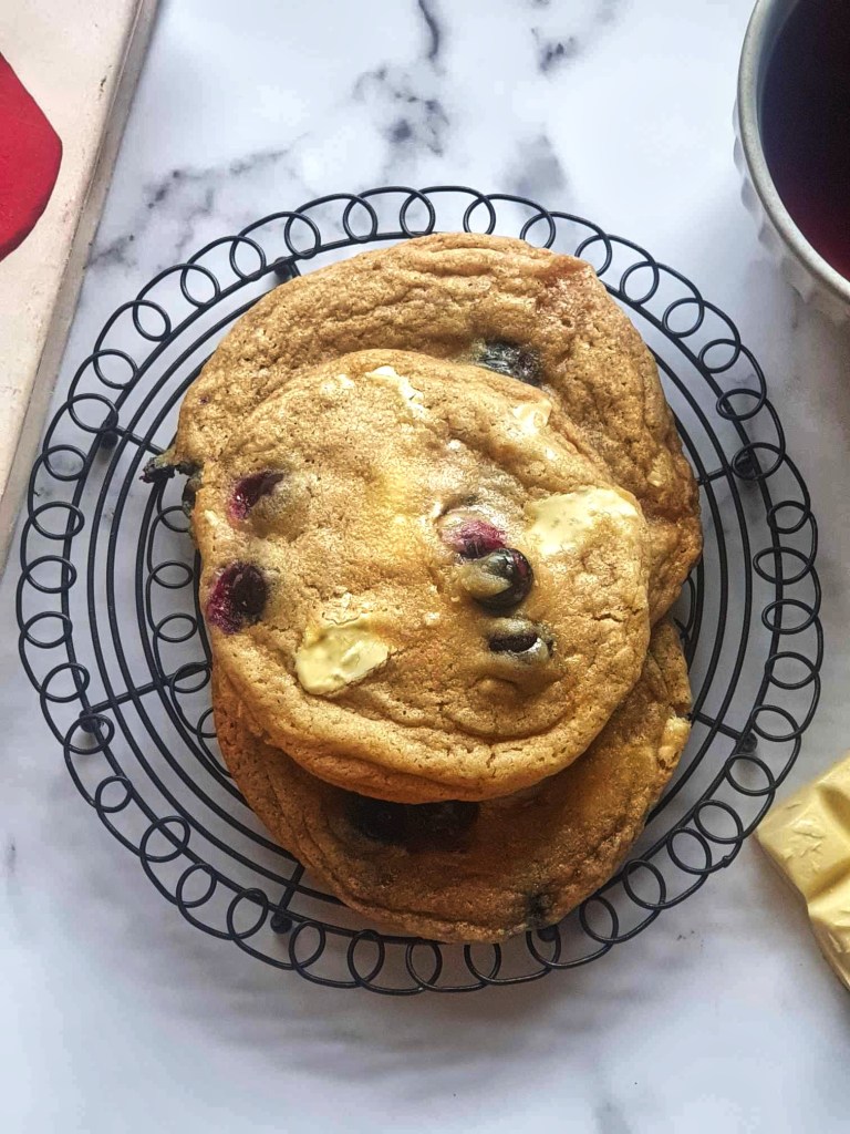 I first stumbled upon the pan-banging chocolate chip cookies from Sarah Kieffer a while ago & have been dying to try them! After making the chocolate chip version a few times, I wanted to experiment with flavours. Thus, the pan-banging blueberry & white chocolate cookie was born! Ps, I think I will be banging all my cookies on my bench top now! So fun & just incredible results.