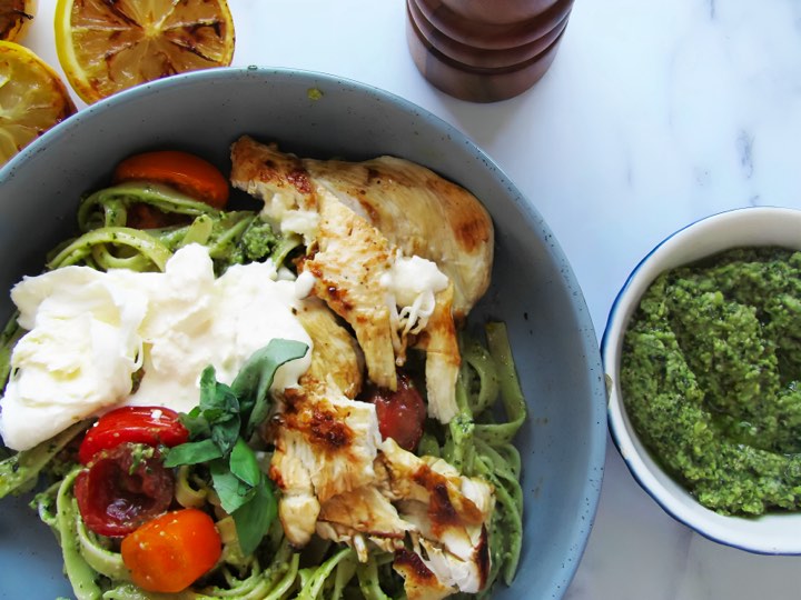 Place pasta onto plates, top with warm cherry tomatoes, chicken breast, torn burrata & extra basil leaves.