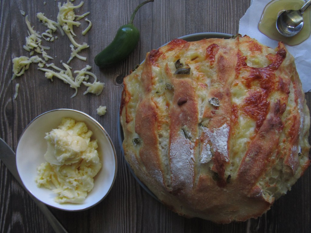 I love this bread! I know 24 hours seems like a long time to let it rise, but trust me it’s so worth it! The crumb is so soft & light. The outside is so crunch & chewy. Its just soooo full of cheese, & the hints of Jalapenos is so delightful.