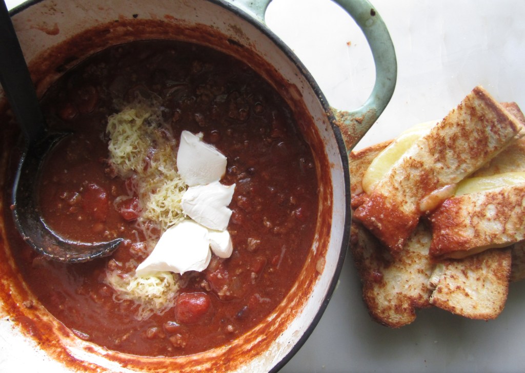 Top chilli with extra grated cheese, sour cream & optionally thinly sliced spring onion. Dip grilled cheese dippers into the chilli & enjoy!
