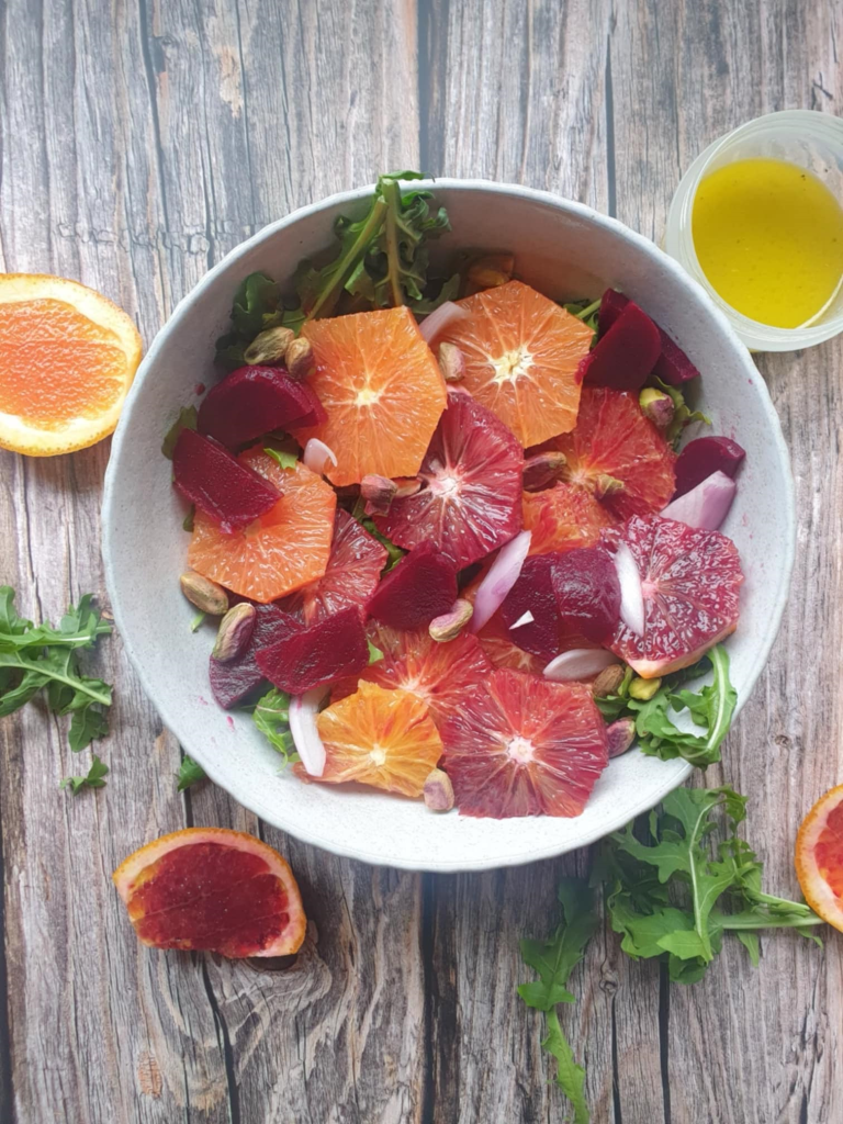 Slice the oranges to between 2-3cm thick, add to the salad.