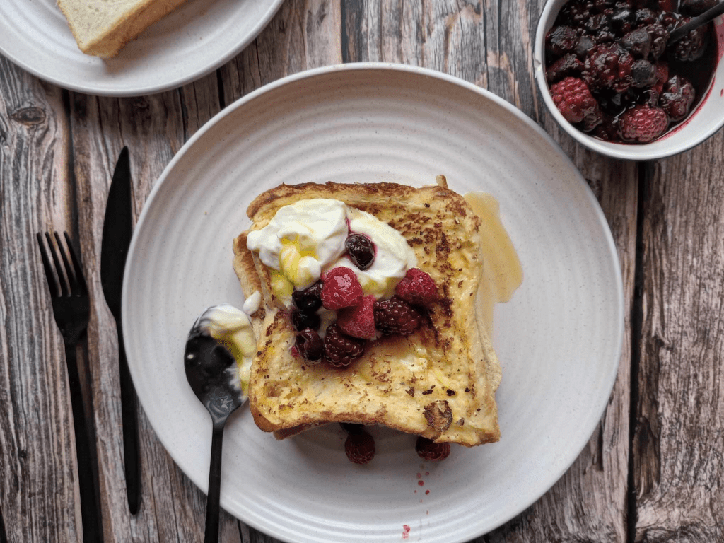 To assemble, place two slices of french toast on a large plate.