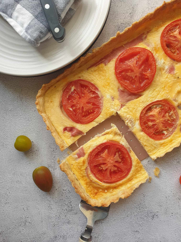 Pour the egg mixture evenly into the quiche crust, place the slices of tomato & proscuitto on top & bake in the oven for 20-25 minutes or until the eggs are cooked through. Slice, Serve on it’s own or with your favourite salad & enjoy!